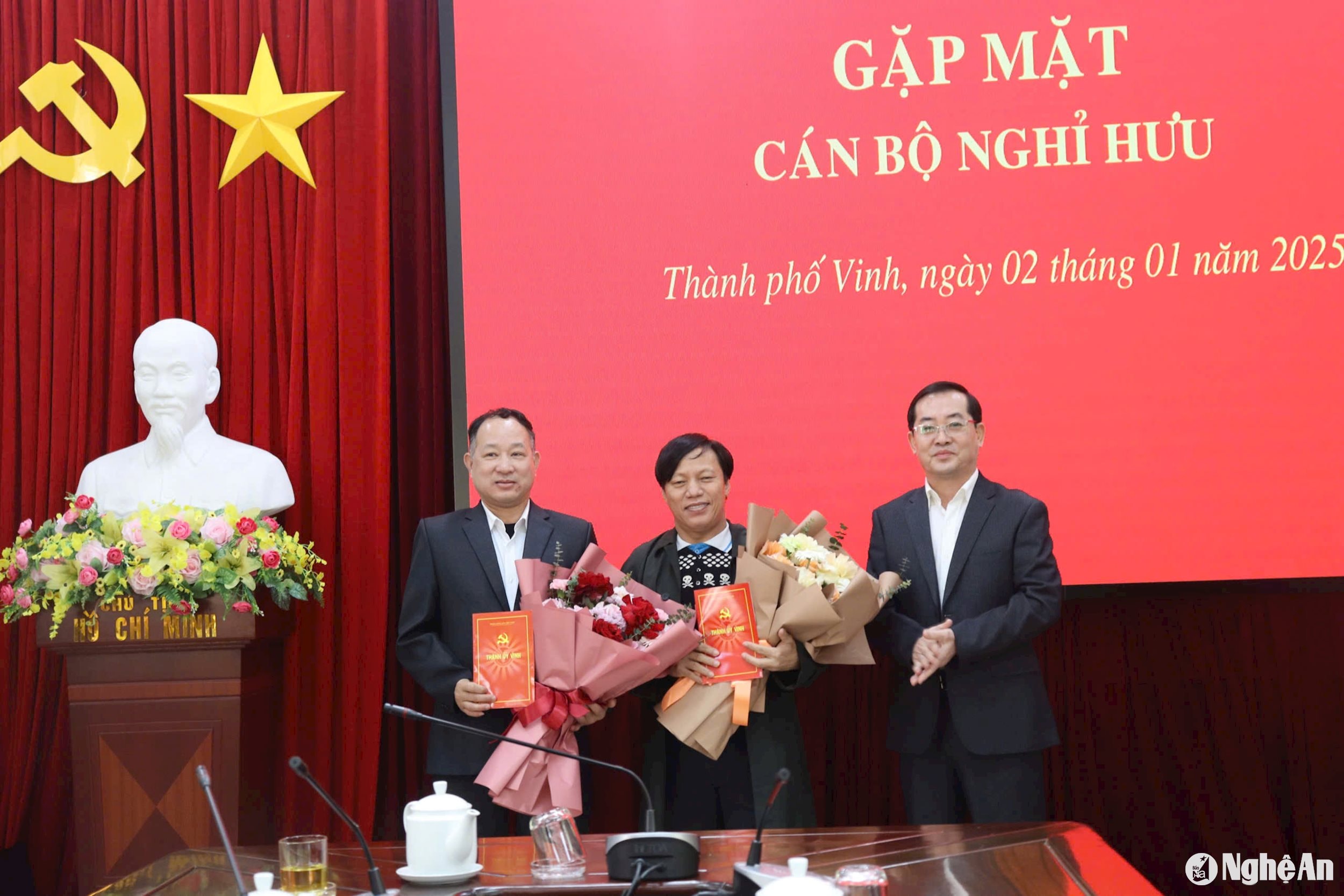 Theo đó, đồng chí Nguyễn Văn Lư – Phó Bí thư Thành ủy Vinh đã trao Quyết định số 930-QĐ/Th.U và 931-QĐ/Th.U ngày 30/12/2024 về việc nghỉ hưu trước tuổi, hưởng chế độ bảo hiểm đối với ông Phạm Trung Thành, chuyên viên Văn phòng Thành ủy và ông Lê Đức Thọ, chuyên viên Ban Dân vận Thành ủy được nghỉ hưu trước tuổi theo Nghị định số 29/2023/NĐ-CP để hưởng chế độ bảo hiểm xã hội từ ngày 1/1/2025.