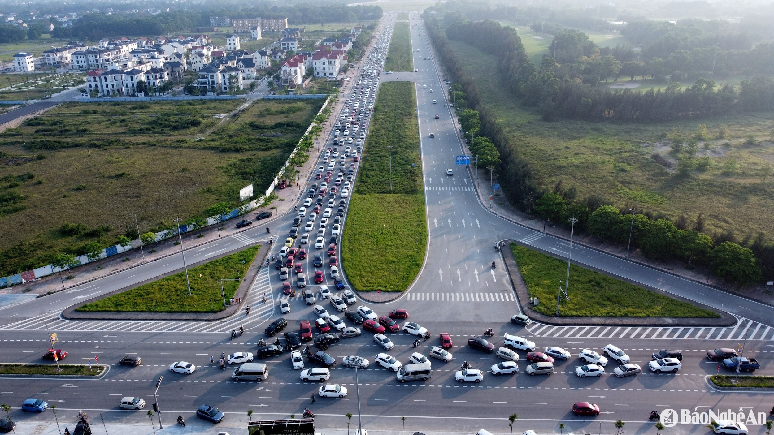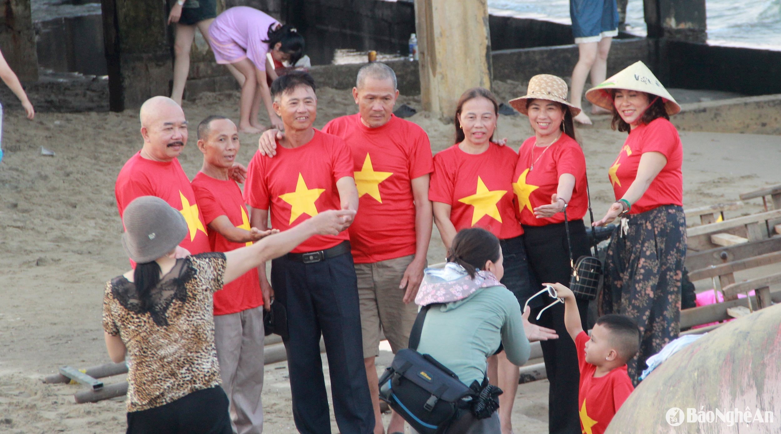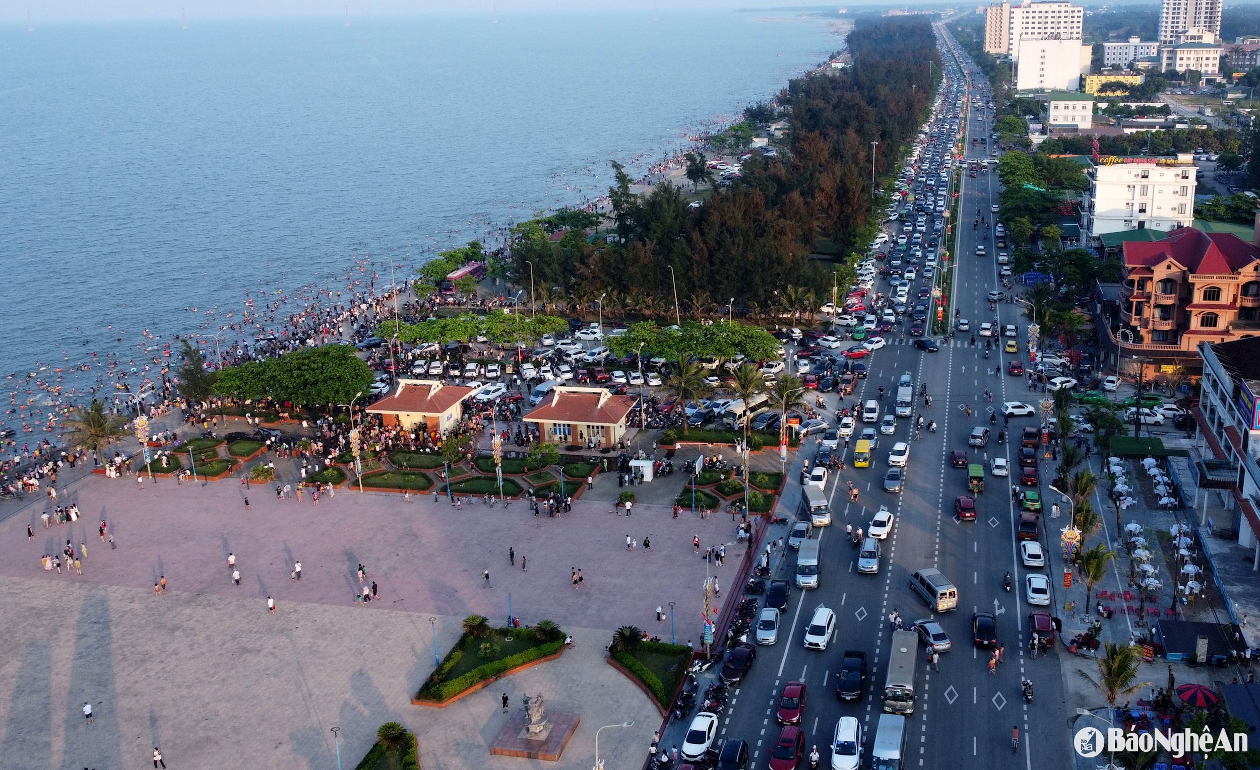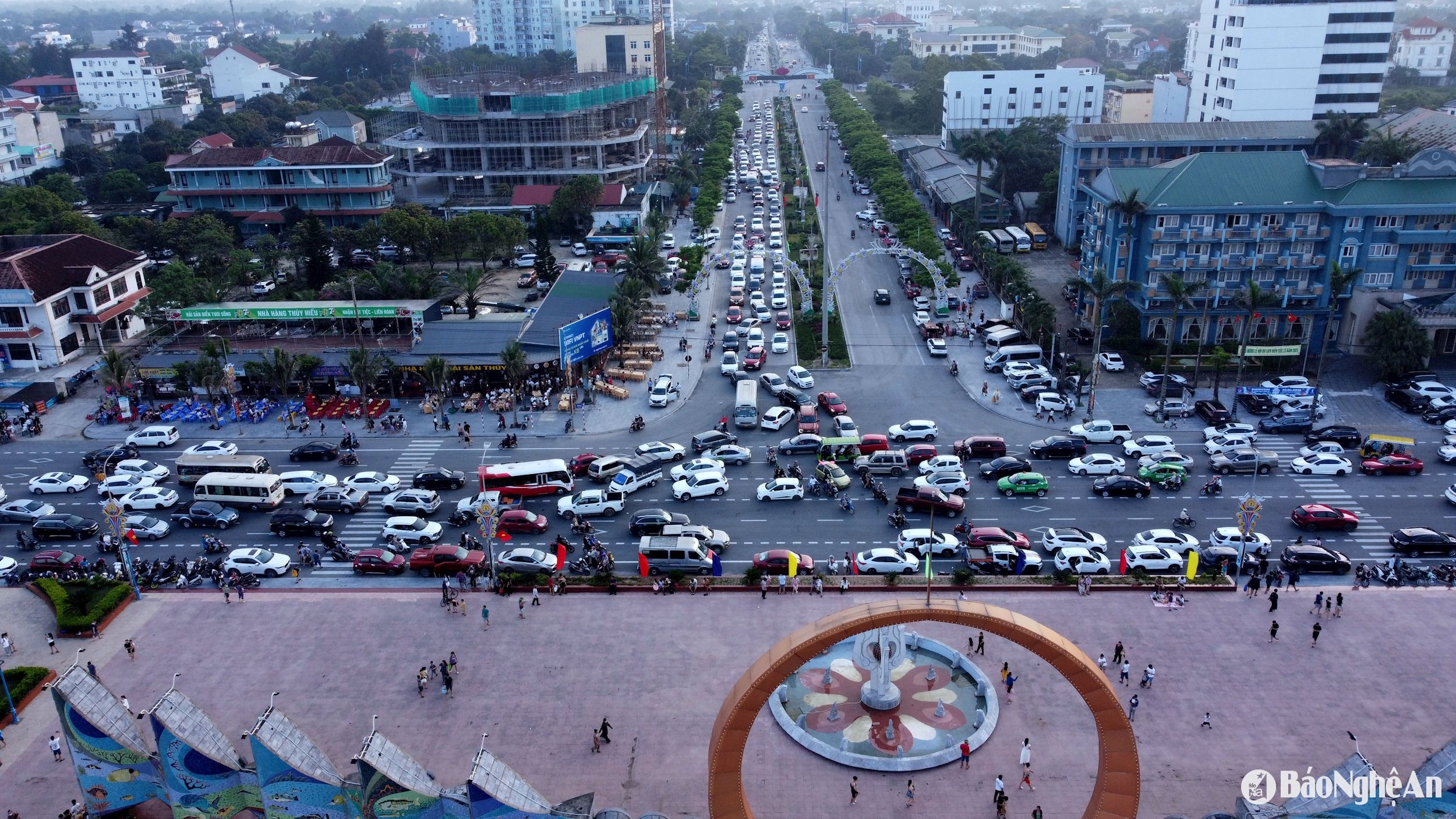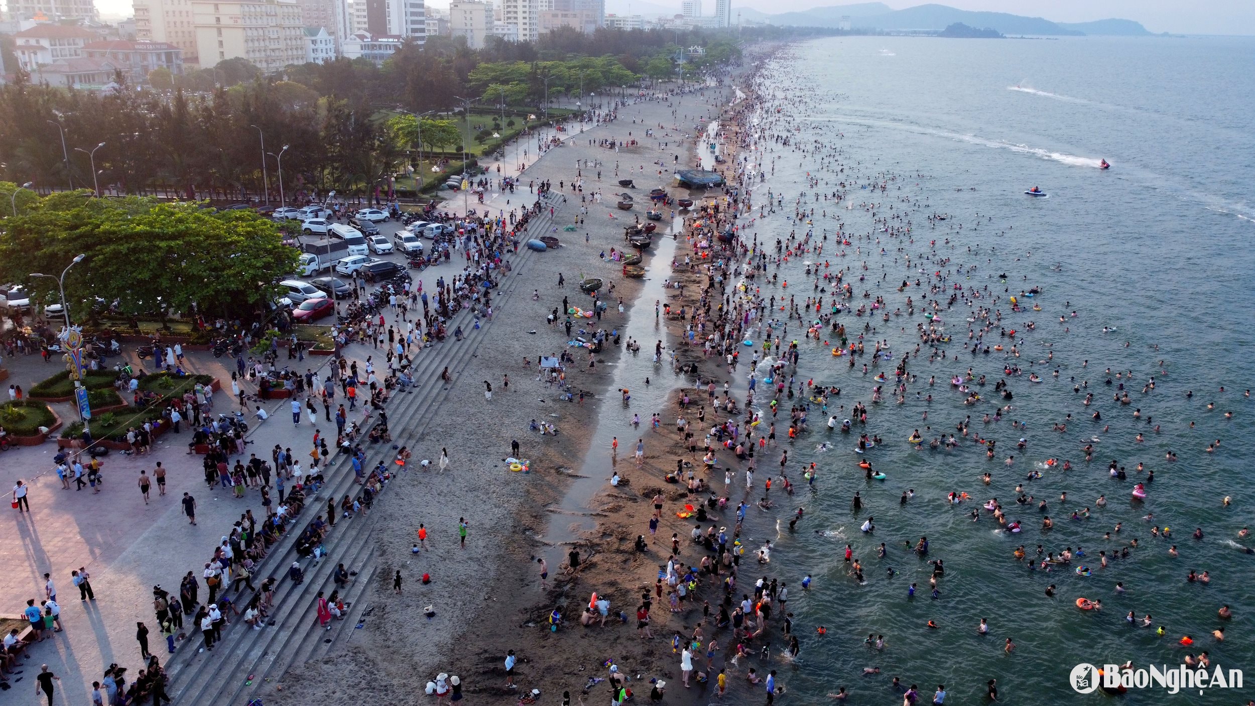 Trong ngày 30/4, hàng vạn khách đã đổ về biển Cửa Lò, Nghệ An để vui chơi, nghỉ dưỡng. Các tuyến đường chật cứng xe cộ, không khí đông vui, náo nhiệt trải dài trên bãi biển.