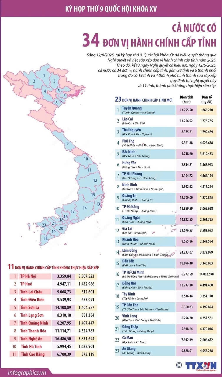Theo đó, số lượng các đơn vị cấp tỉnh trên cả nước giảm từ 63 còn 34, với những điều chỉnh rõ nét về ranh giới, diện tích và quy mô dân số.