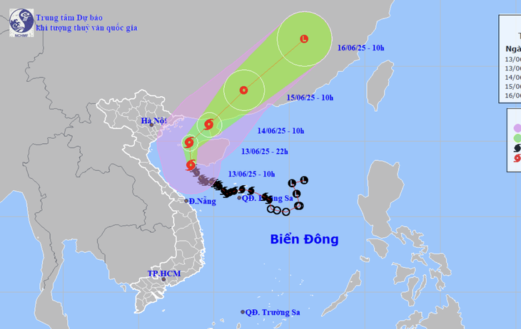 Theo Trung tâm Dự báo khí tượng thủy văn quốc gia lúc 10h sáng 13-6, tâm bão số 1 mạnh cấp 11, giật cấp 14, đang ở trên vùng biển phía tây nam đảo Hải Nam (Trung Quốc).