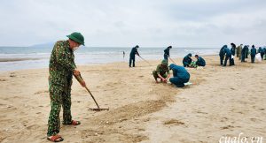 Gần 300 cán bộ, chiến sỹ, dân quân tự vệ Cửa Lò tham gia thu gom rác dọc bãi tắm