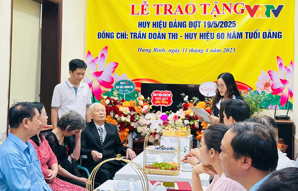 Chiều ngày 11 tháng 4, Đảng ủy phường Hưng Bình tổ chức Lễ trao tặng huy hiệu 60 năm tuổi đảng đợt 19/5/2025 cho đảng viên Trần Doãn Thi thuộc chi bộ khối 16. Các đồng chí Bùi Duy Sơn – Chánh văn phòng đoàn đại biểu Quốc hội và HĐND tỉnh Nghệ An, Trần Thị Cẩm Tú – UVBTV Thành ủy, Phó chủ tịch UBND TP đã tới nhà riêng tại khối 16 phường Hưng Bình để dự lễ và trao huy hiệu cho đảng viên.