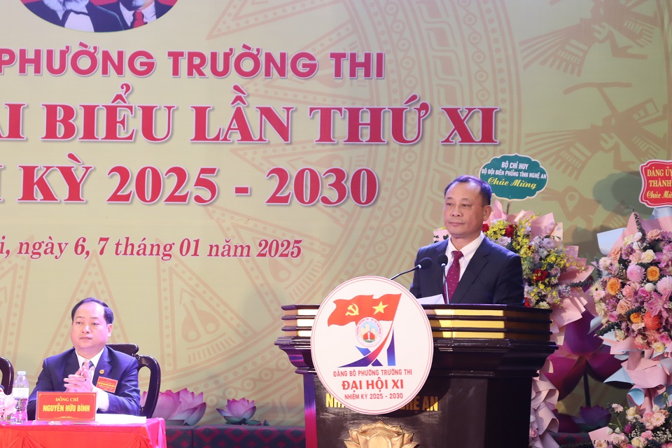 Phát biểu chỉ đạo Đại hội, đồng chí Bí thư Thành ủy nhiệt liệt biểu dương những kết quả đã đạt được nhiệm kì qua, các báo cáo và tham luận trình bày tại hội nghị với tinh thần thẳng thắn, dân chủ. Về phương hướng, nhiệm vụ trong nhiệm kì tới, đồng chí yêu cầu cần bám sát định hướng phát triển thành phố Vinh nhằm khai thác tiểm năng, lợi thế của phường trong phát triển kinh tế; xây dựng phường trở thành đô thị văn minh kiểu mẫu; đưa giáo dục nằm trong top đầu; hướng tới phường không có hộ cận nghèo; phường kiểu mẫu về an ninh trật tự. Chăm lo xây dựng Đảng, hệ thống chính trị vững mạnh. Các đại biểu cân nhắc lựa chọn những đồng chí đủ phẩm chất, cơ cấu hợp lí vào ban chấp hành khóa mới. Ngay sau Đại hội, cần xây dựng chương hành động để sớm đưa nghị quyết vào cuộc sống. Đồng chí tin tưởng với khí thế của Đại hội, phường Trường Thi sẽ phát triển giàu đẹp, văn minh.