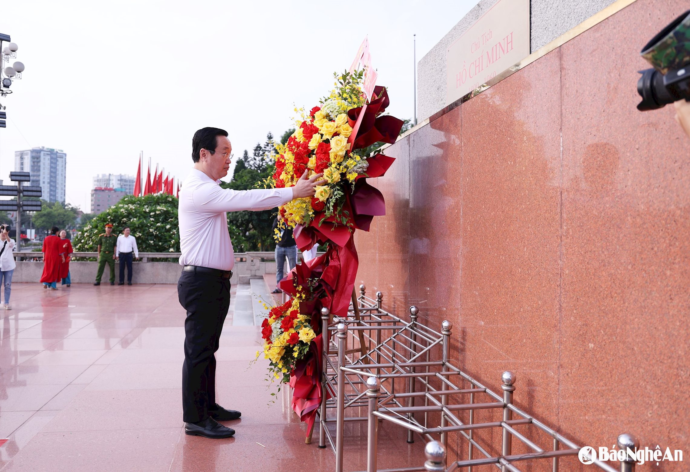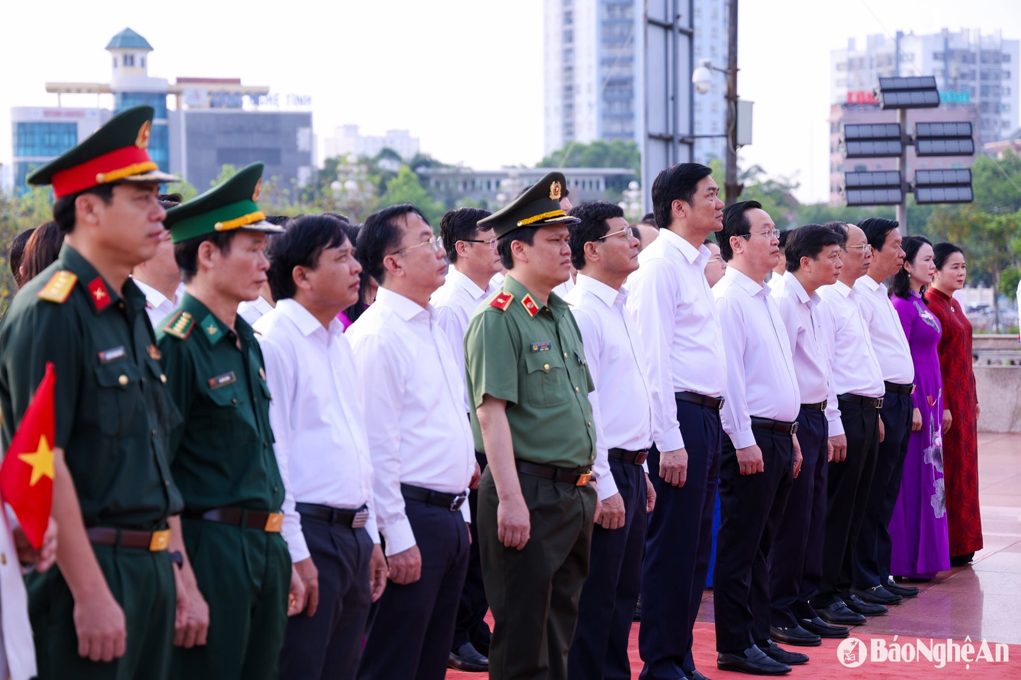 Đồng chí Nguyễn Đức Trung – Bí thư Tỉnh ủy kính cẩn dâng hoa tưởng niệm Chủ tịch Hồ Chí Minh tại Tượng đài Bác Hồ. Ảnh: Đức Anh