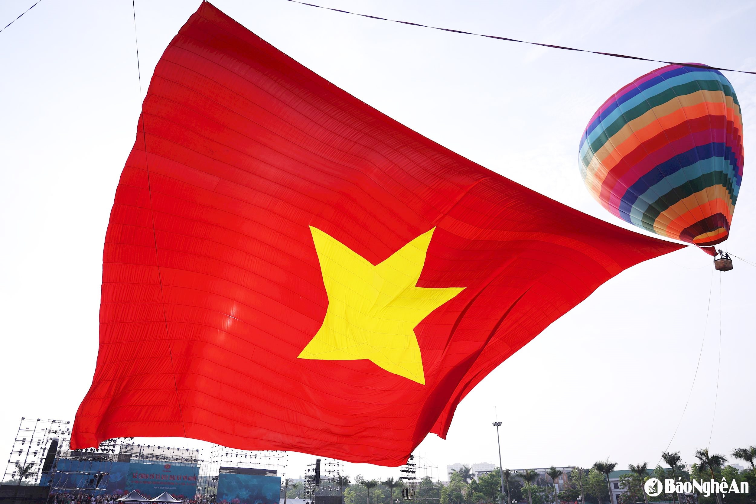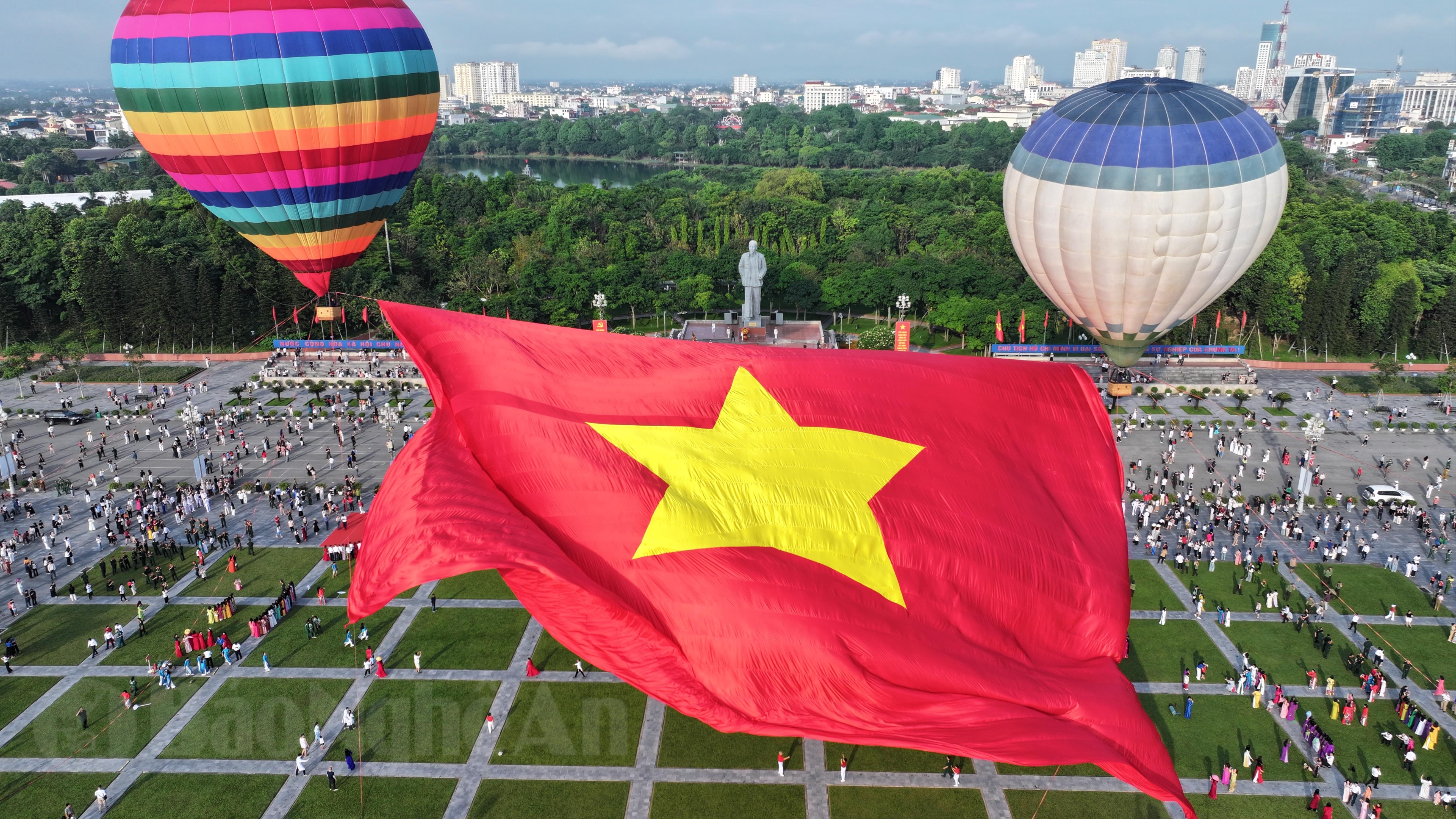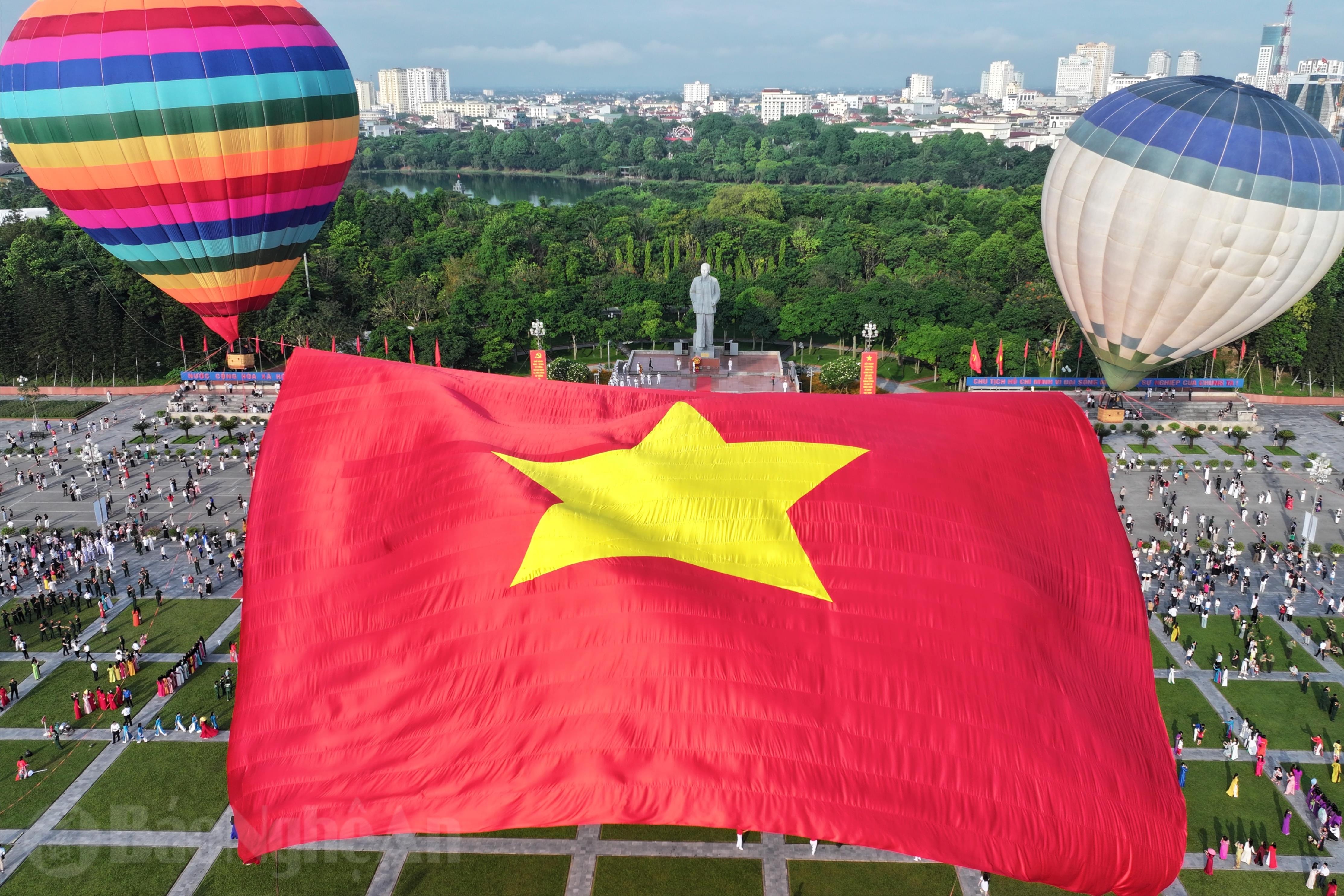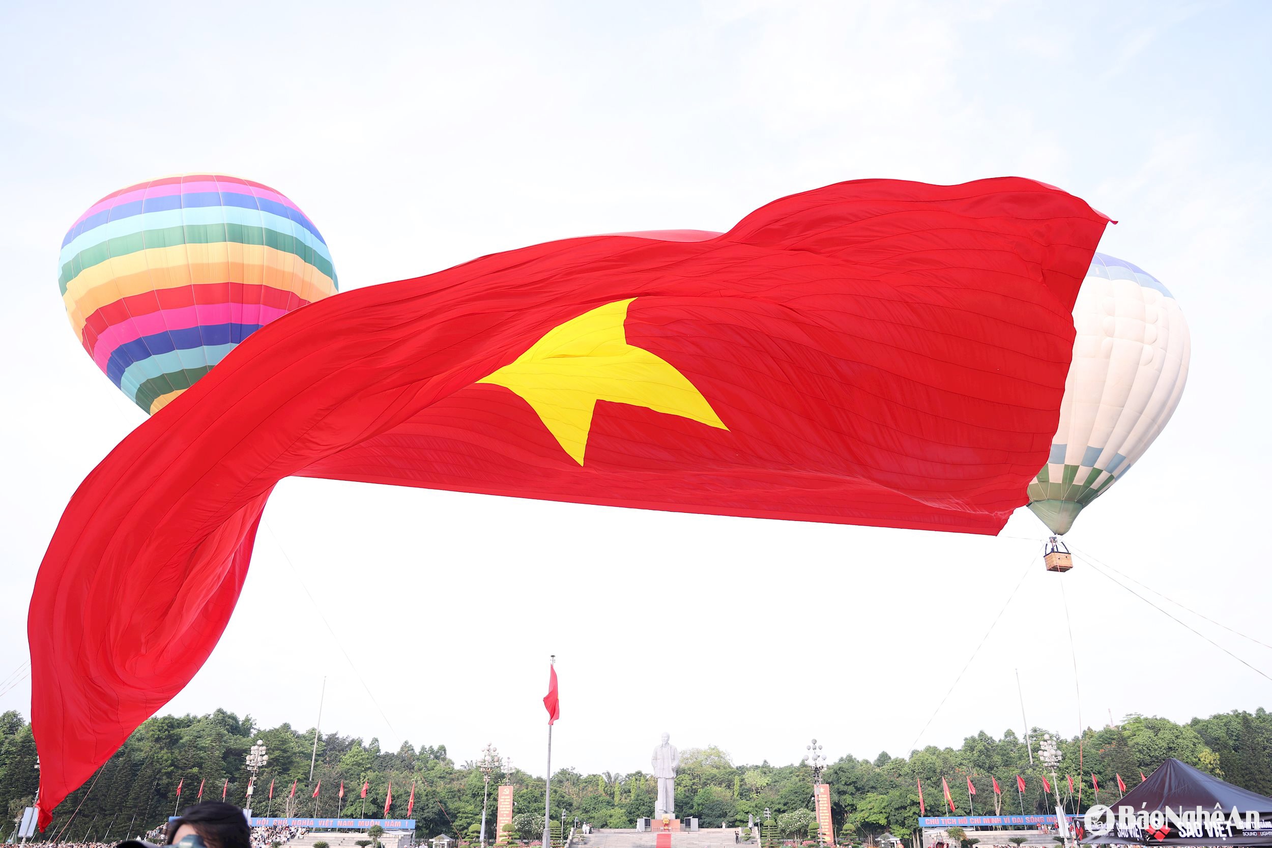 Đặc biệt, tại lễ chào cờ, 2 khí cầu mang lá cờ Tổ quốc khổng lồ có diện tích 2.025m² đã được bay lên bầu trời thành phố Vinh, tạo nên khoảnh khắc thiêng liêng, thể hiện lòng thành kính, niềm tự hào và biết ơn sâu sắc đối với Chủ tịch Hồ Chí Minh – lãnh tụ vĩ đại của dân tộc Việt Nam.