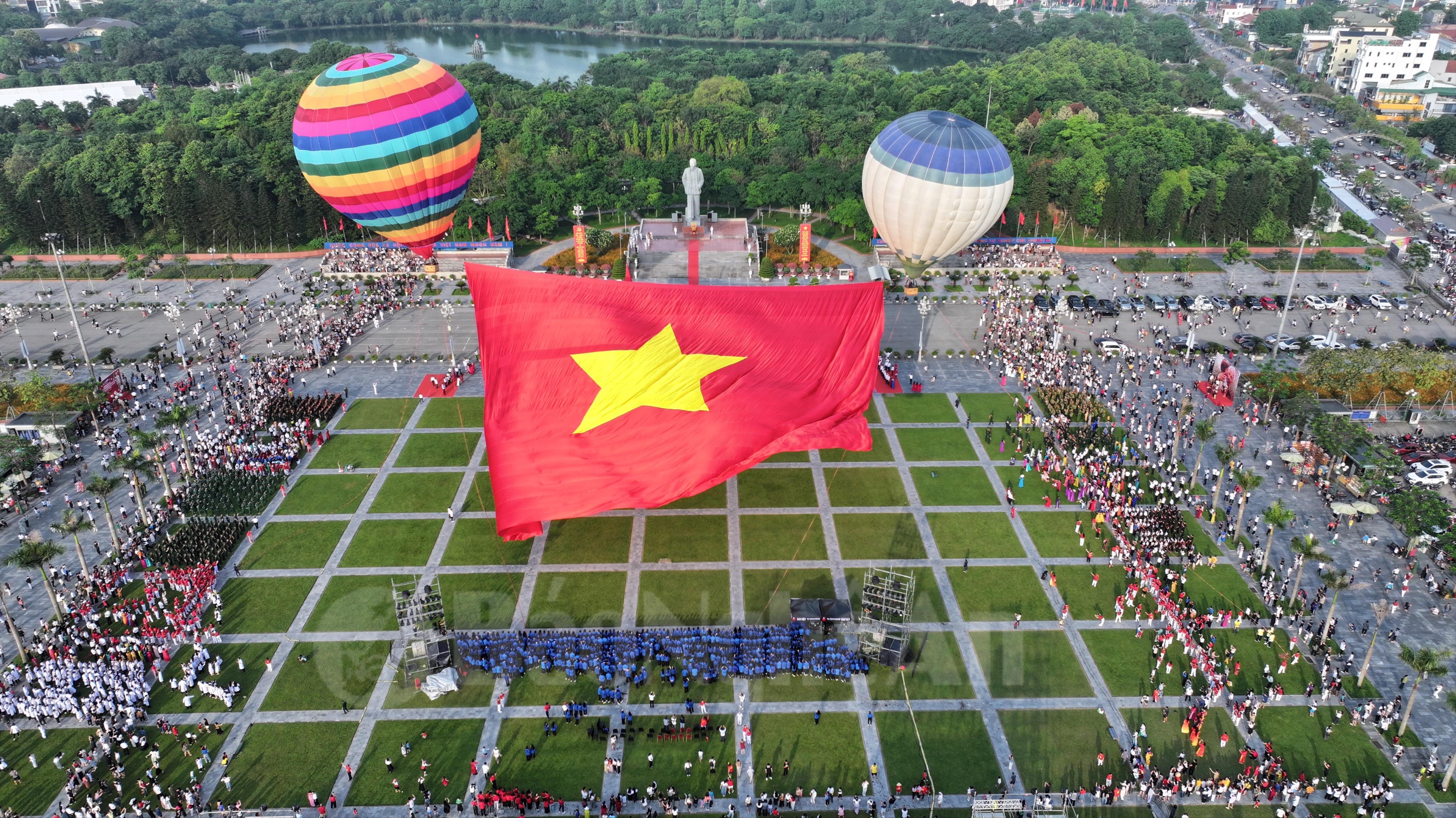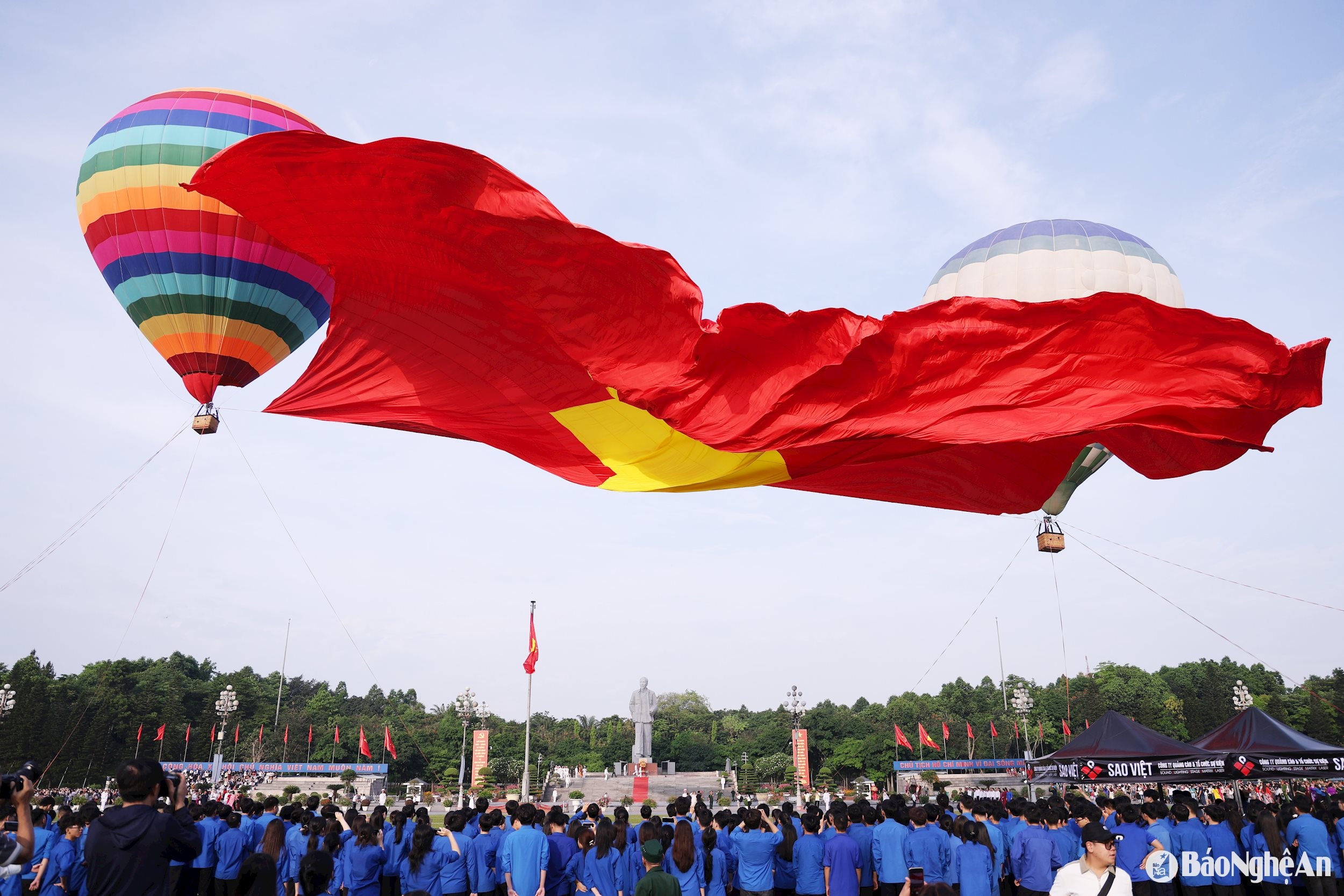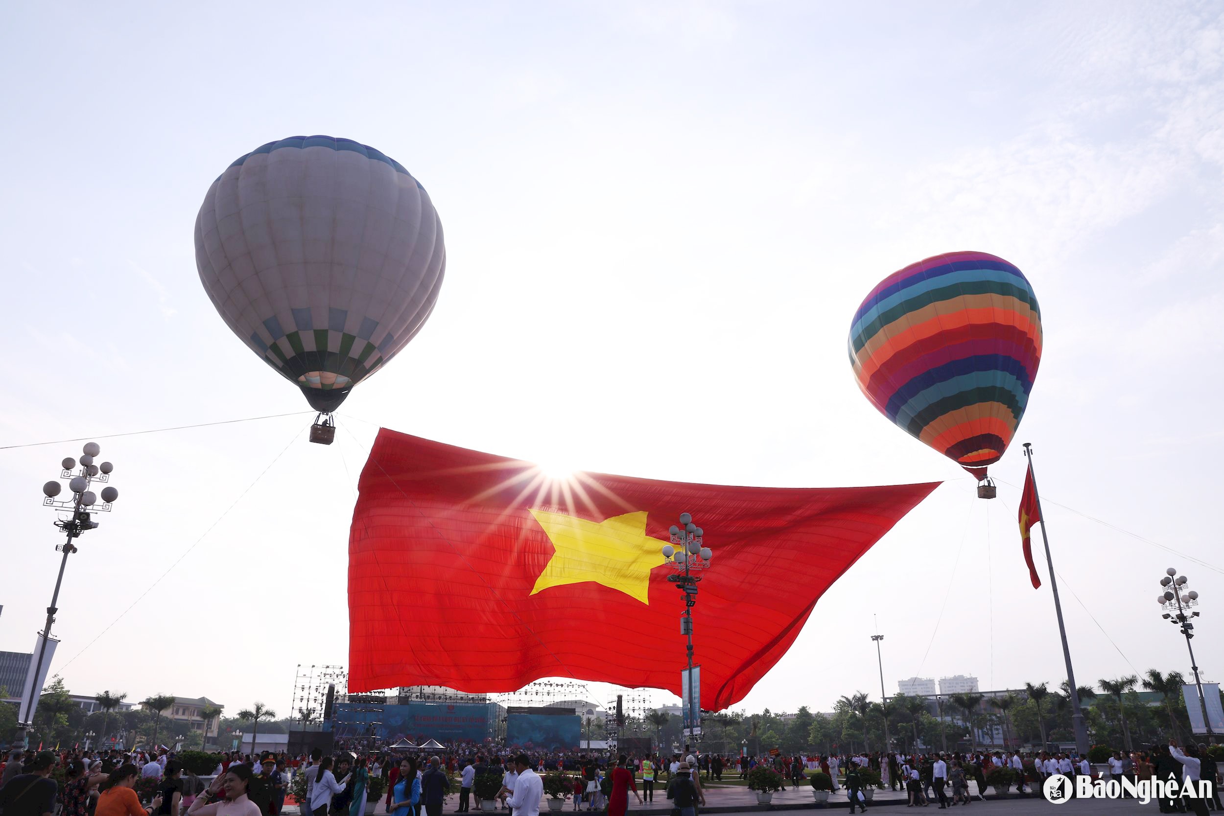 Đặc biệt, tại lễ chào cờ, 2 khí cầu mang lá cờ Tổ quốc khổng lồ có diện tích 2.025m² đã được bay lên bầu trời thành phố Vinh, tạo nên khoảnh khắc thiêng liêng, thể hiện lòng thành kính, niềm tự hào và biết ơn sâu sắc đối với Chủ tịch Hồ Chí Minh – lãnh tụ vĩ đại của dân tộc Việt Nam.