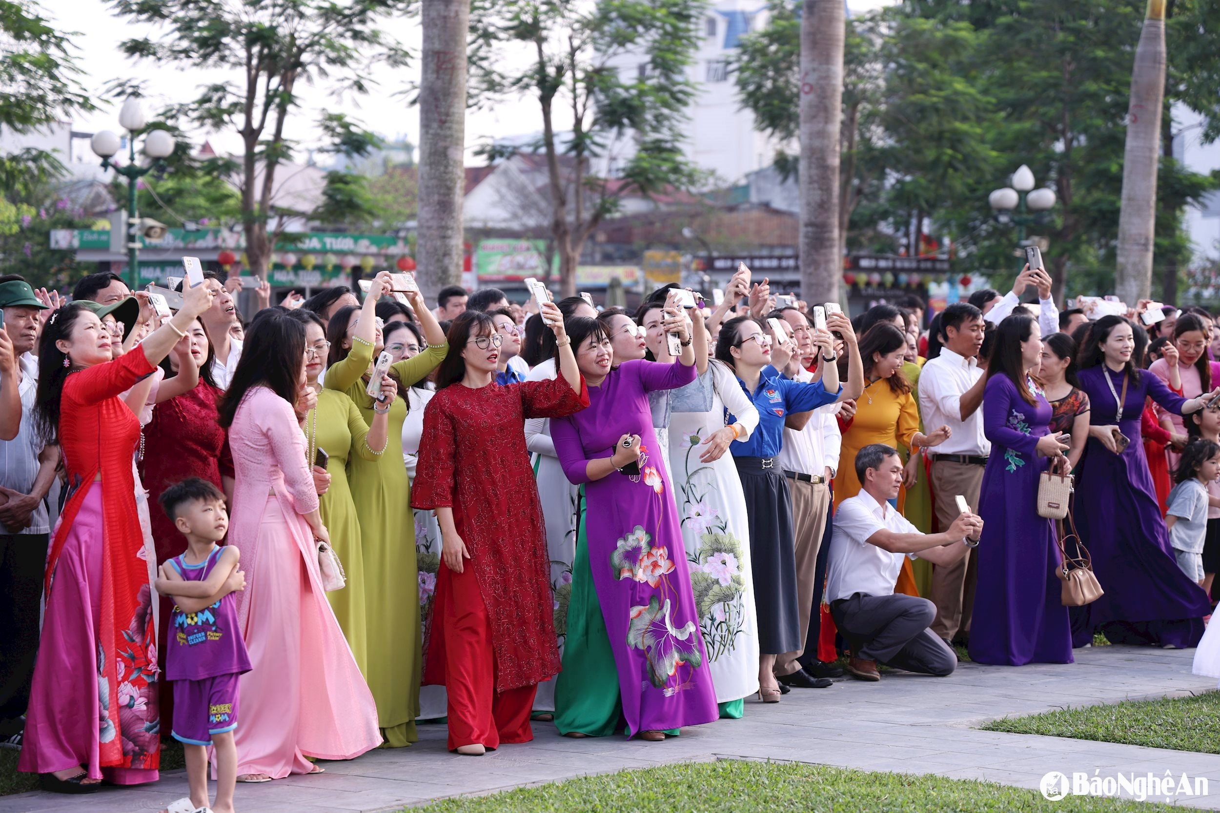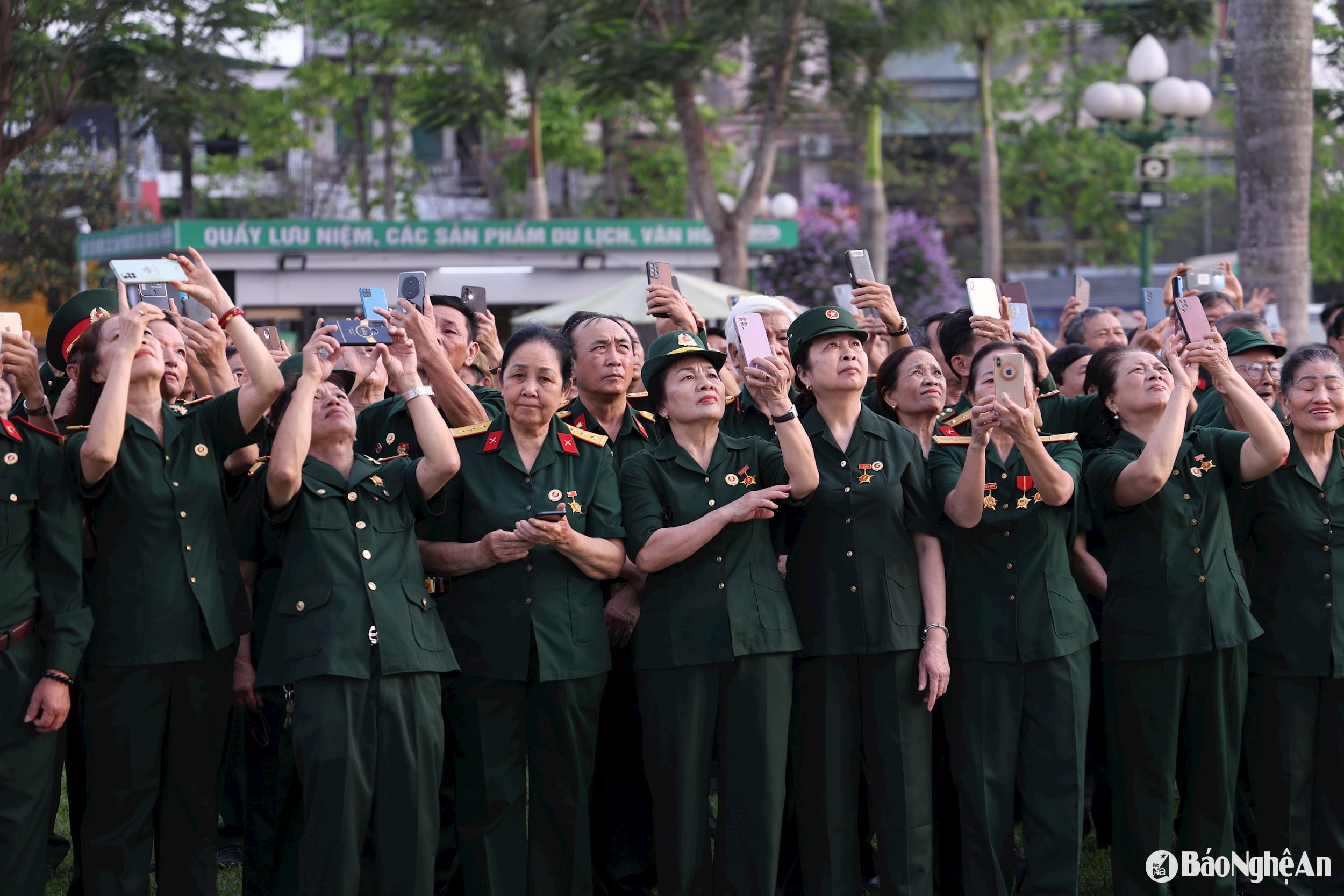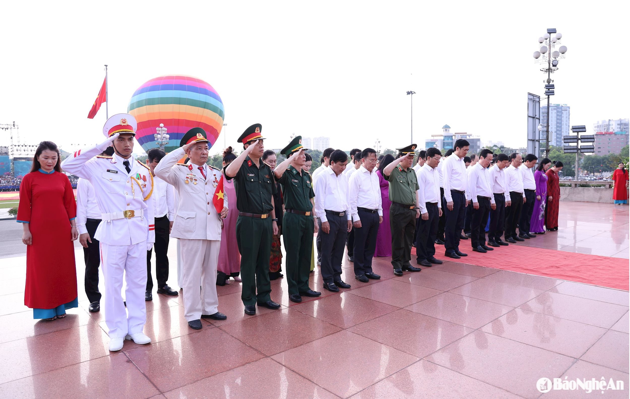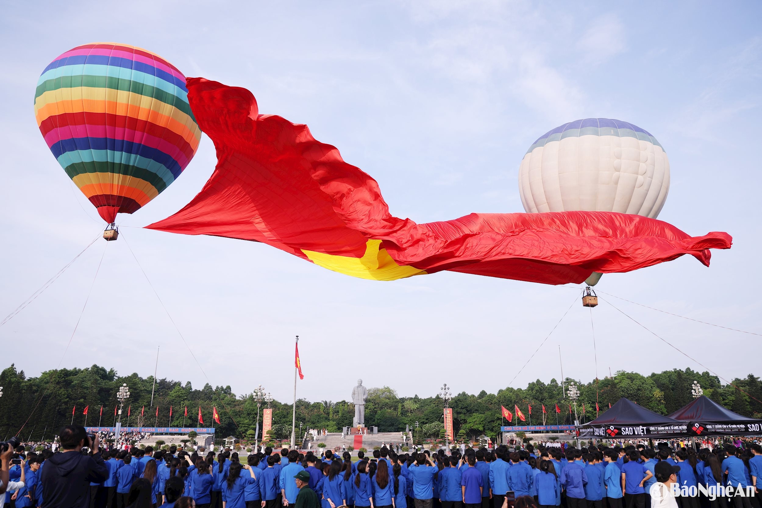Đặc biệt, tại lễ chào cờ, 2 khí cầu mang lá cờ Tổ quốc khổng lồ có diện tích 2.025m² đã được bay lên bầu trời thành phố Vinh, tạo nên khoảnh khắc thiêng liêng, thể hiện lòng thành kính, niềm tự hào và biết ơn sâu sắc đối với Chủ tịch Hồ Chí Minh – lãnh tụ vĩ đại của dân tộc Việt Nam.