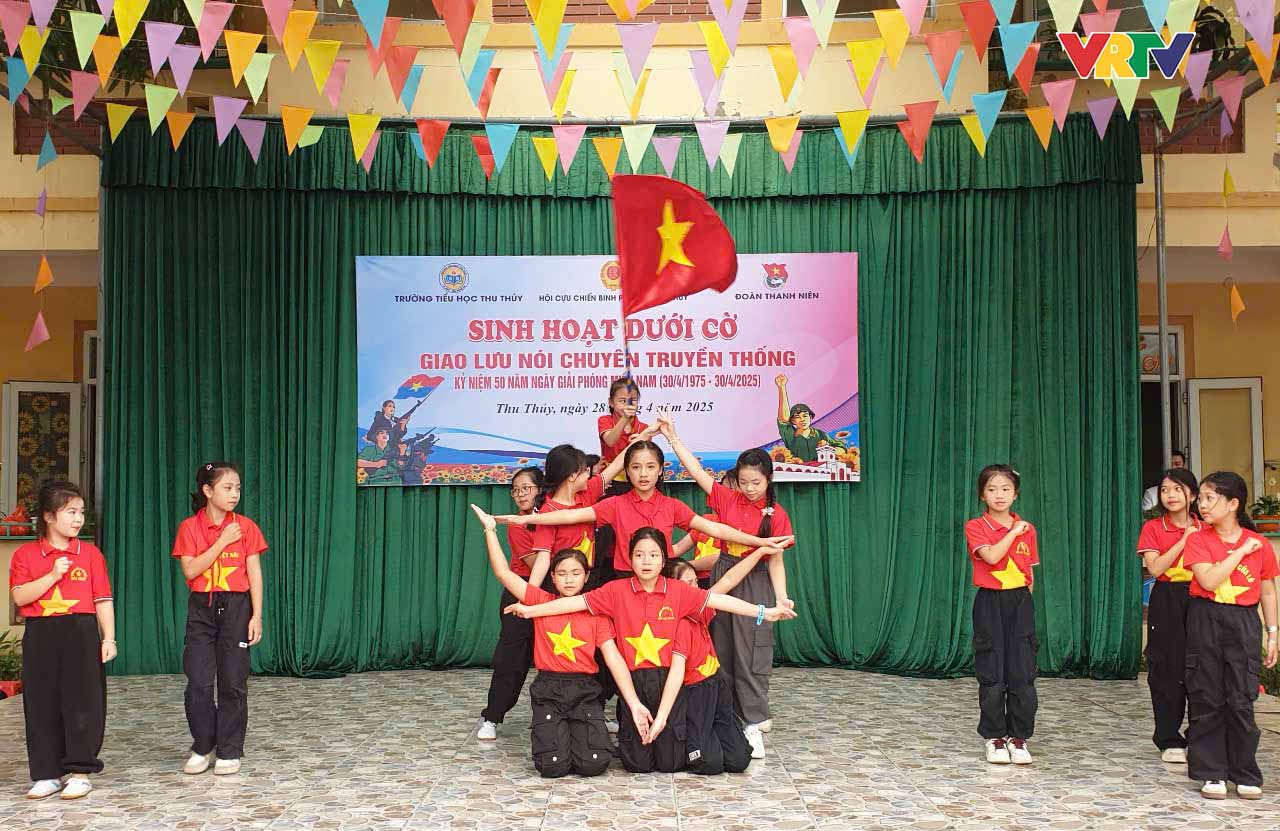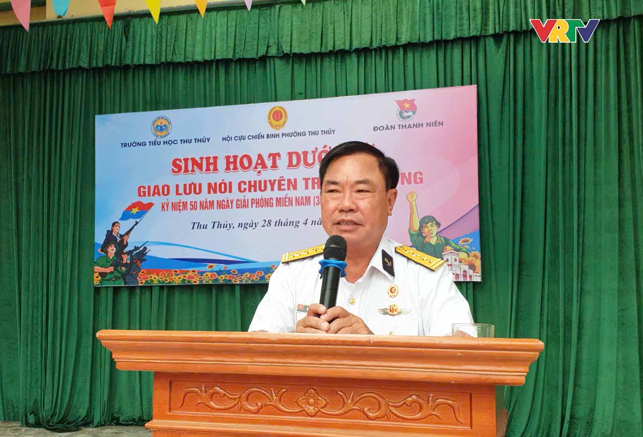 Trong buổi sinh hoạt dưới cờ, đồng chí Nguyễn Xuân Hùng – Chủ tịch Hội CCB phường Thu Thủy đã kể cho các em học sinh và giáo viên nghe những câu chuyện, ký ức hào hùng về một thời “xẻ dọc Trường Sơn” đi cứu nước, đồng thời khái quát toàn bộ cuộc tổng tiến công và nổi dậy mùa Xuân năm 1975 mà đỉnh cao là chiến dịch Hồ Chí Minh lịch sử đã giành thắng lợi hoàn toàn, giải phóng miền Nam, thống nhất đất nước. Ngày 30 tháng 4 năm 1975 đã đi vào lịch sử dân tộc như một mốc son chói lọi đưa đất nước ta bước vào kỷ nguyên mới, kỷ nguyên độc lập dân tộc và chủ nghĩa xã hội. Trong điều kiện hành quân gian khổ, hình ảnh người chiến sỹ Quân đội Nhân dân Việt Nam và bao lớp thế hệ cha ông đã giữ vững khí thế lạc quan, anh dũng chiến đấu giành độc lập tự do cho Tổ quốc.