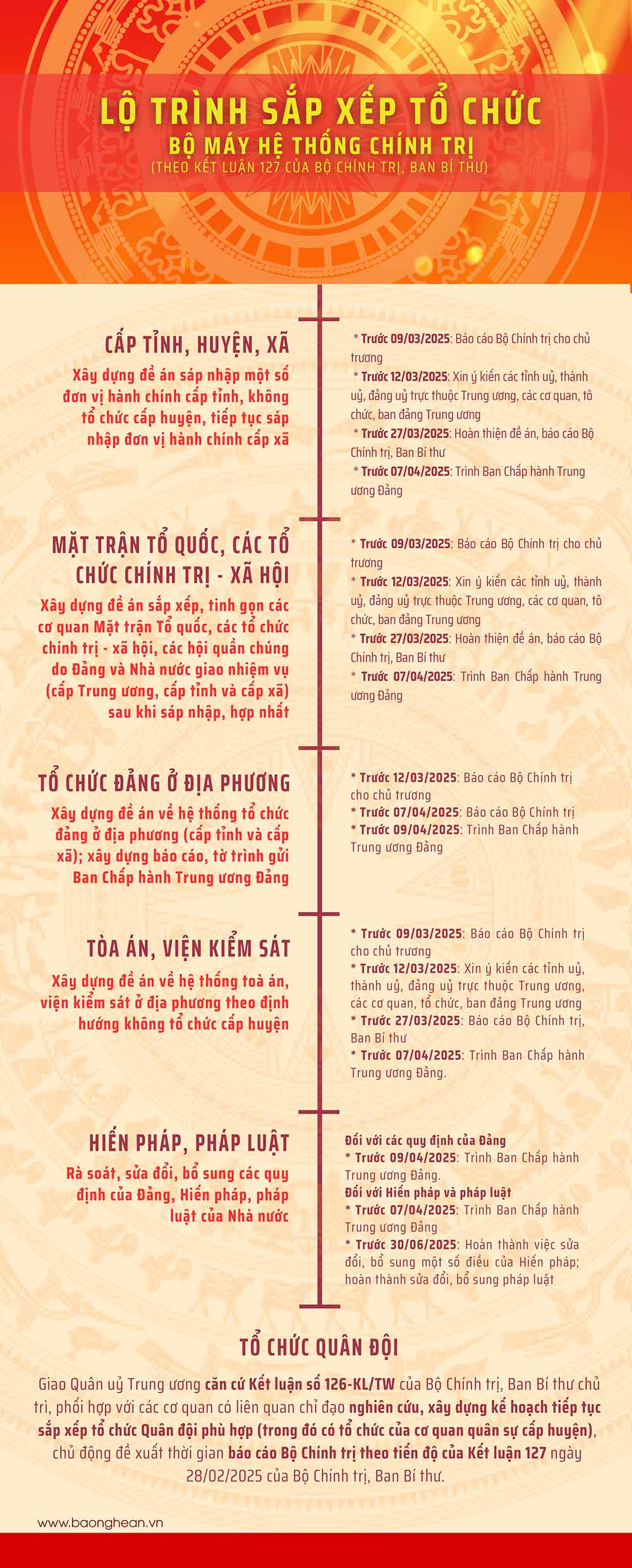 Tại Kết luận 127-KL/TW của Bộ Chính trị, Ban Bí thư về triển khai nghiên cứu, đề xuất tiếp tục sắp xếp tổ chức bộ máy của hệ thống chính trị đã quy định rõ tiến độ, mốc thời gian thực hiện.