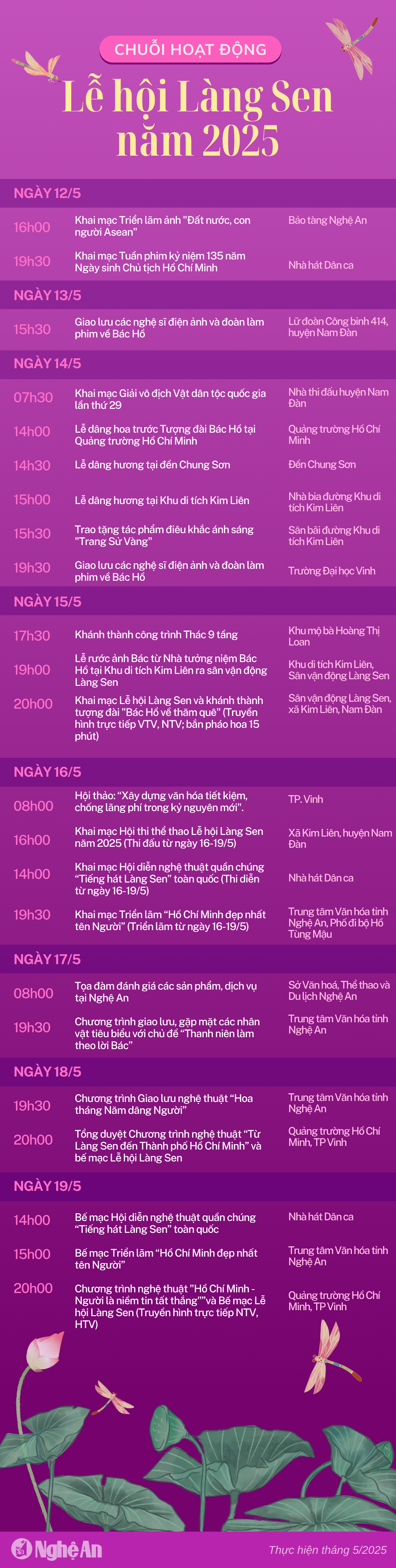 Chuỗi sự kiện văn hóa trọng đại kỷ niệm 135 năm Ngày sinh Chủ tịch Hồ Chí Minh sẽ diễn ra từ ngày 12-19/5 tại Nghệ An, với nhiều hoạt động ý nghĩa. Lễ hội tôn vinh giá trị văn hóa truyền thống, tình yêu quê hương, đất nước và lòng kính trọng đối với vị lãnh tụ vĩ đại của dân tộc.