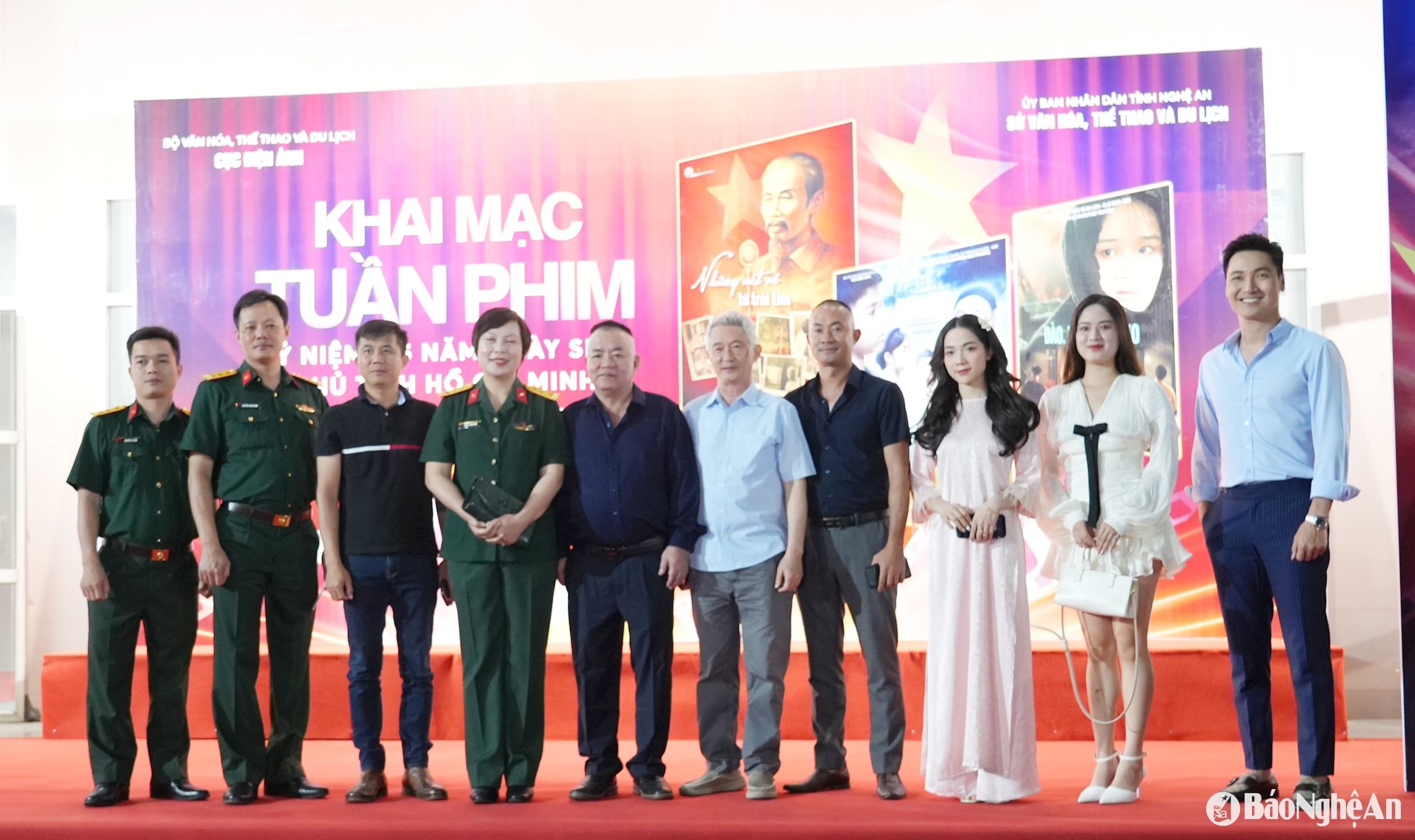 Đồng chí Đặng Trần Cường – Cục trưởng Cục Điện ảnh, Bộ Văn hóa, Thể thao và Du lịch, đại diện lãnh đạo tỉnh Nghệ An và Sở Văn hóa, Thể thao và Du lịch Nghệ An cùng các nghệ sĩ, đoàn làm phim tại chương trình khai mạc. Ảnh: Thanh Quỳnh