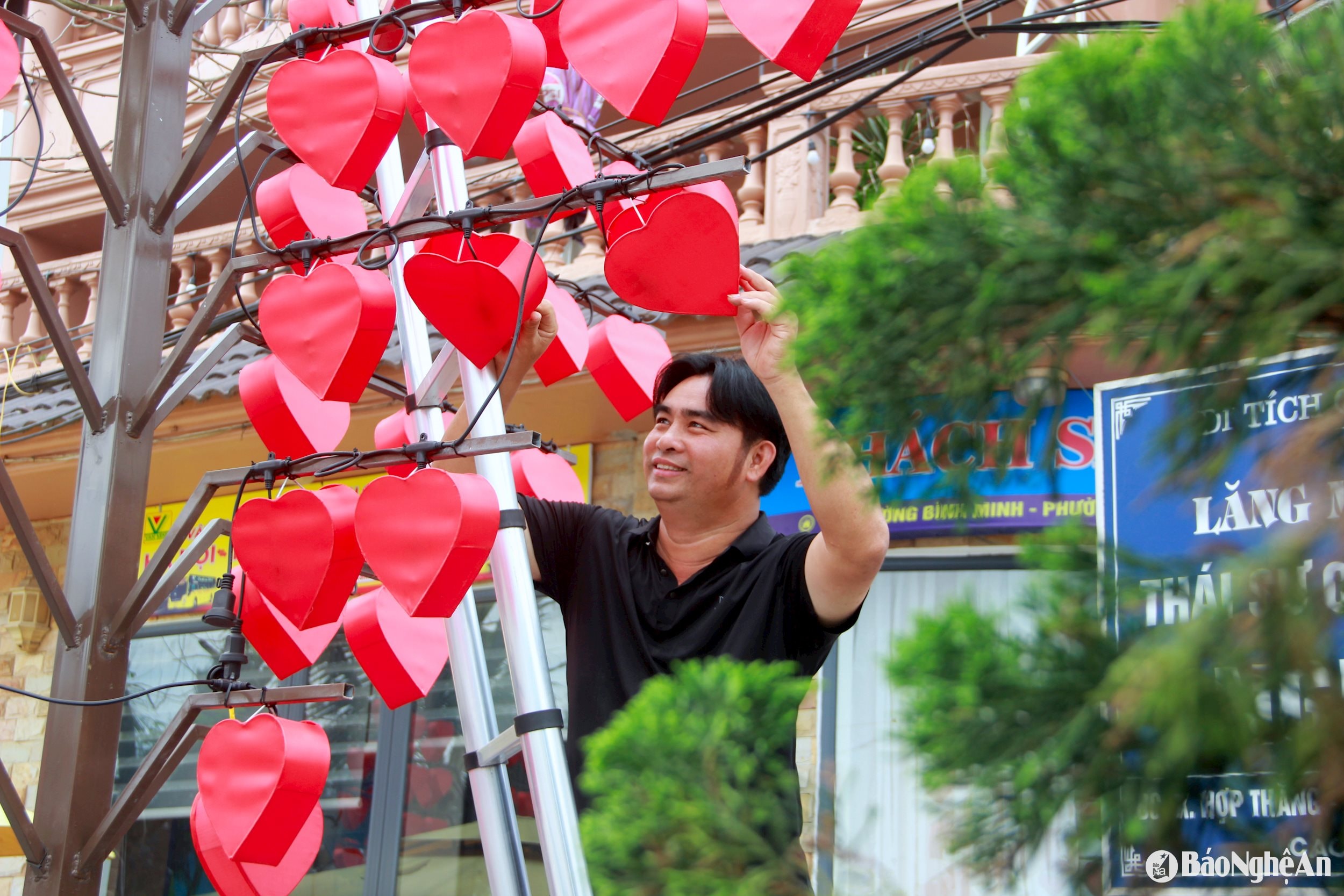 Anh Mai Duy Nam trang trí bên ngoài khách sạn, tạo điểm nhấn để đón chào du khách về nghỉ dưỡng. Ảnh: Quang An