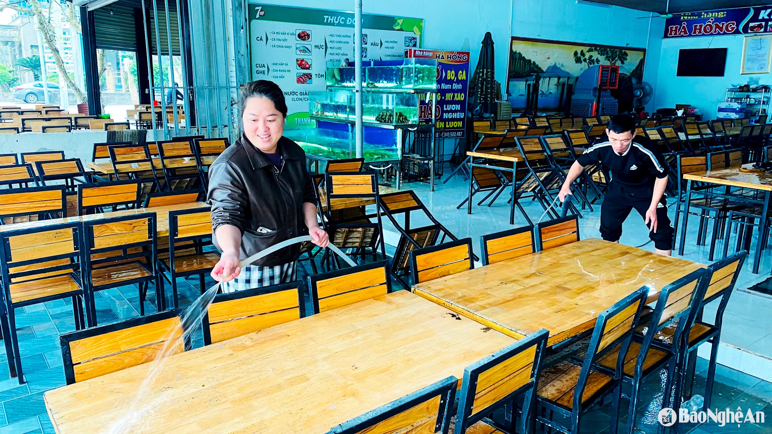 Chủ các nhà hàng lau dọn bàn ghế, tổng vệ sinh chuẩn bị cho ngày mai mạc. Ảnh: Quang An