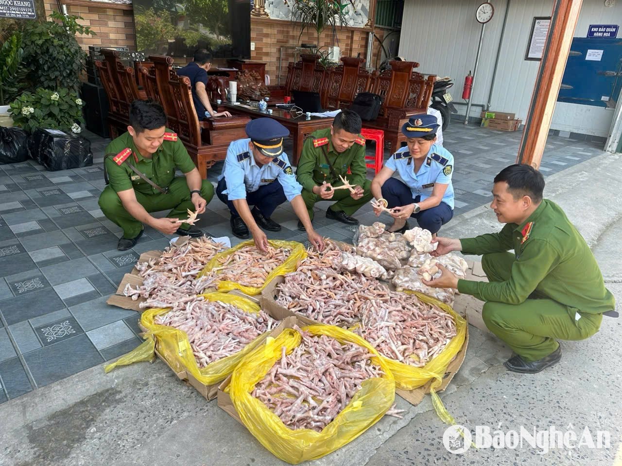 Qua kiểm tra, lực lượng chức năng phát hiện cơ sở đang bày bán 350 kg chân gà đông lạnh và 125 kg đuôi lợn đông lạnh. Toàn bộ số hàng hóa trên đều không có nhãn mác, bao bì hay bất kỳ giấy tờ chứng minh nguồn gốc, xuất xứ hợp pháp nào như: hóa đơn mua bán, hợp đồng, tờ khai hải quan…