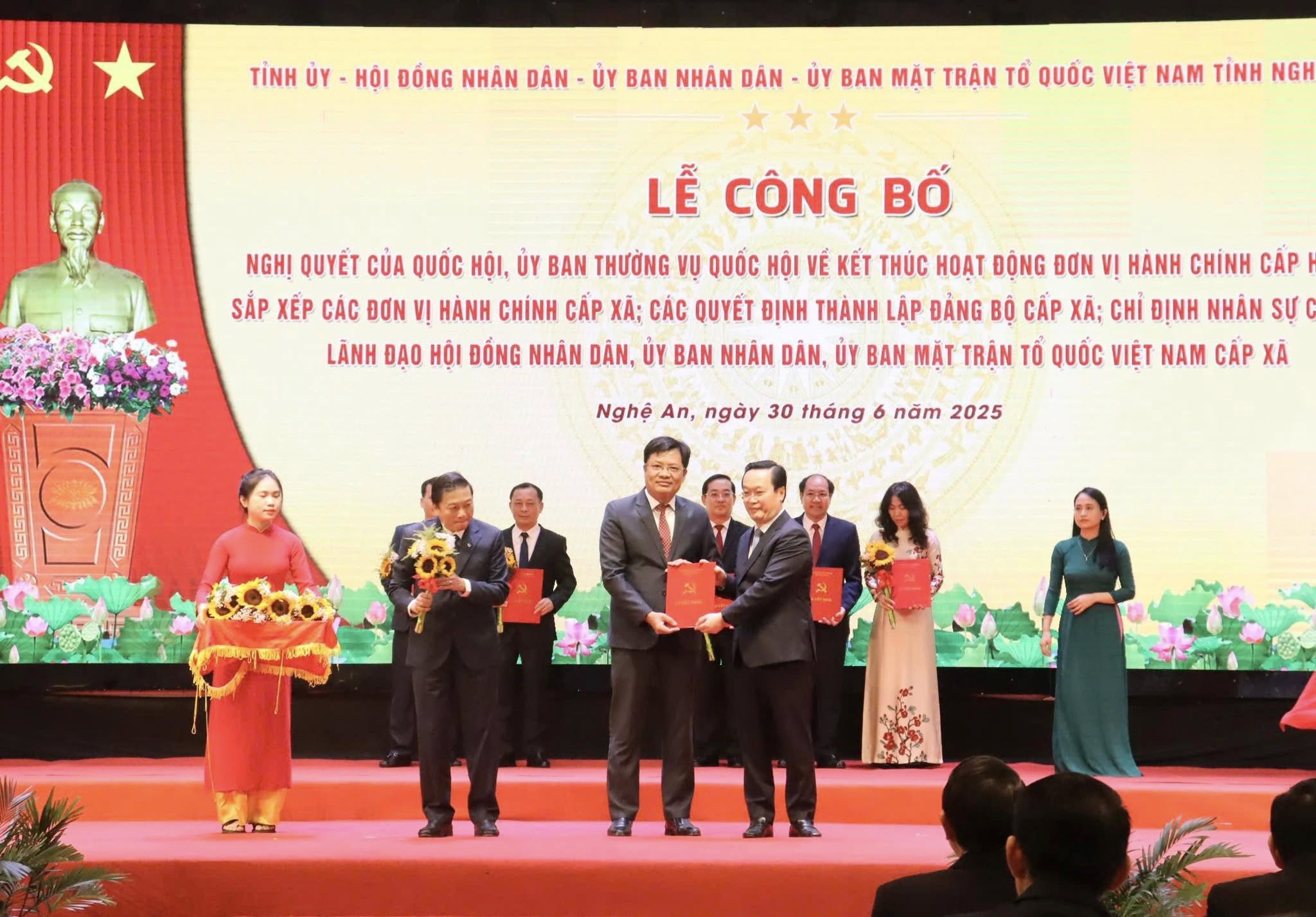 Sáng nay: 30/6/2025, tỉnh Nghệ An tổ chức Lễ công bố các nghị quyết, quyết định về thực hiện mô hình chính quyền địa phương 2 cấp.Đồng chí Nguyễn Đức Hải – Ủy viên Ban Chấp hành Trung ương Đảng, Phó Chủ tịch Quốc hội thay mặt lãnh đạo Đảng, Nhà nước dự tại điểm cầu trung tâm tại TP. Vinh. Cùng dự có các đồng chí lãnh đạo các ban ngành Trung ương.Lãnh đạo tỉnh Nghệ An có các đồng chí: Nguyễn Đức Trung – Bí thư Tỉnh ủy; Hoàng Nghĩa Hiếu – Phó Bí thư Thường trực Tỉnh ủy, Chủ tịch HĐND tỉnh; Lê Hồng Vinh – Phó Bí thư Tỉnh ủy, Chủ tịch UBND tỉnh; Võ Thị Minh Sinh – Phó Bí thư Tỉnh ủy, Chủ tịch Ủy ban MTTQ Việt Nam tỉnh, Trưởng đoàn ĐBQH tỉnh Nghệ An.Tại buổi lễ, đồng chí Võ Thị Minh Sinh – Phó Bí thư Tỉnh uỷ, Chủ tịch UBMTTQ, Trưởng Đoàn đại biểu Quốc hội tỉnh đã công bố Nghị quyết của Quốc hội, Ủy ban Thường vụ Quốc hội về kết thúc hoạt động đơn vị hành chính cấp huyện, sắp xếp các đơn vị hành chính cấp xã; các quyết định thành lập đảng bộ cấp xã; chỉ định nhân sự cấp ủy, lãnh đạo HĐND, UBND, Ủy ban MTTQ Việt Nam cấp xã.