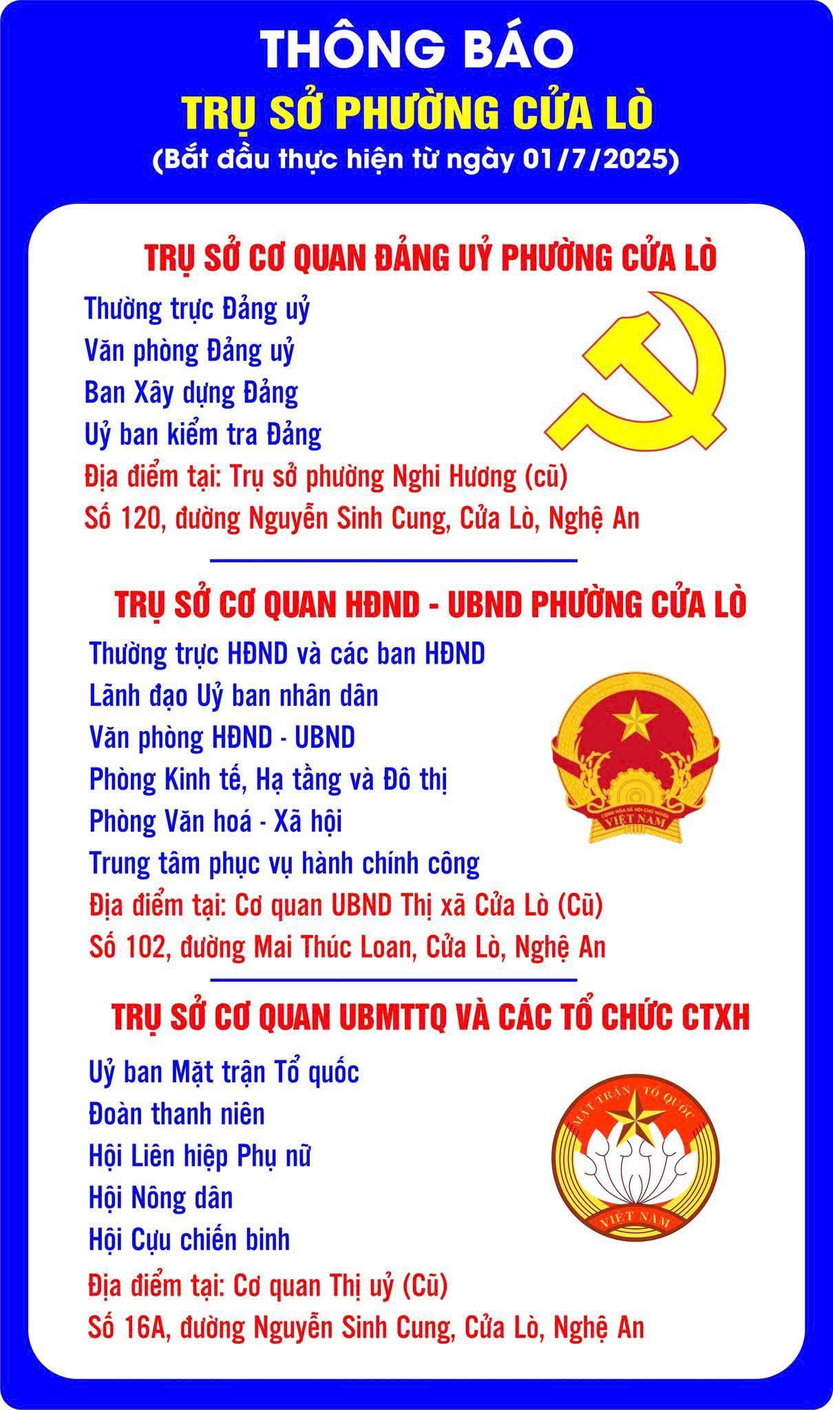 Thực hiện Nghị quyết số 1678/NQ-UBTVQH15 ngày 16/6/2025 của Ủy ban Thường vụ Quốc hội khóa XV về việc sắp xếp các đơn vị hành chính cấp xã của tỉnh Nghệ An năm 2025 và Phương án tổ chức bộ máy chính quyền địa phương sau sắp xếp đơn vị hành chính, phường Cửa Lò, tỉnh Nghệ An sẽ chính thức đi vào hoạt động từ ngày 01 tháng 07 năm 2025