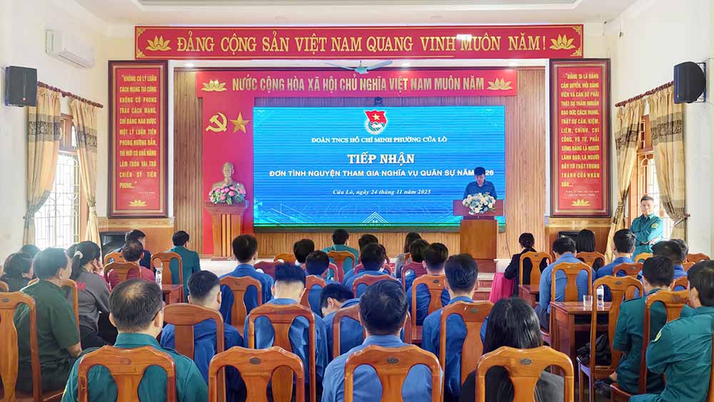 Sáng 24/11, BTV Đoàn phường phối hợp với BCH Quân sự phường Cửa Lò tổ chức chương trình tiếp nhận đơn tình nguyện tham gia NVQS năm 2026 của các thanh niên trên địa bàn. Tham dự chương trình có các đồng chí: Nguyễn Thị Thành An – Phó Bí thư Thường trực Đảng ủy phường Cửa Lò; Hoàng Thanh Tiến – UVBTV Đảng ủy, Chỉ huy trưởng BCH quân sự phường; Hoàng Đinh Thùy Dung – ĐUV, PCTTT UB MTTQ VN phường, Chủ tịch Hội Nông dân phường; Phùng Thị Lê Na – ĐUV, PCT UB MTTQ VN phường, Bí thư đoàn phường cùng cán bộ Ban Chỉ huy quân sự, BTV đoàn phường, đại diện 20 gia đình và thanh niên viết đơn tình nguyện tham gia NVQS năm 2026.