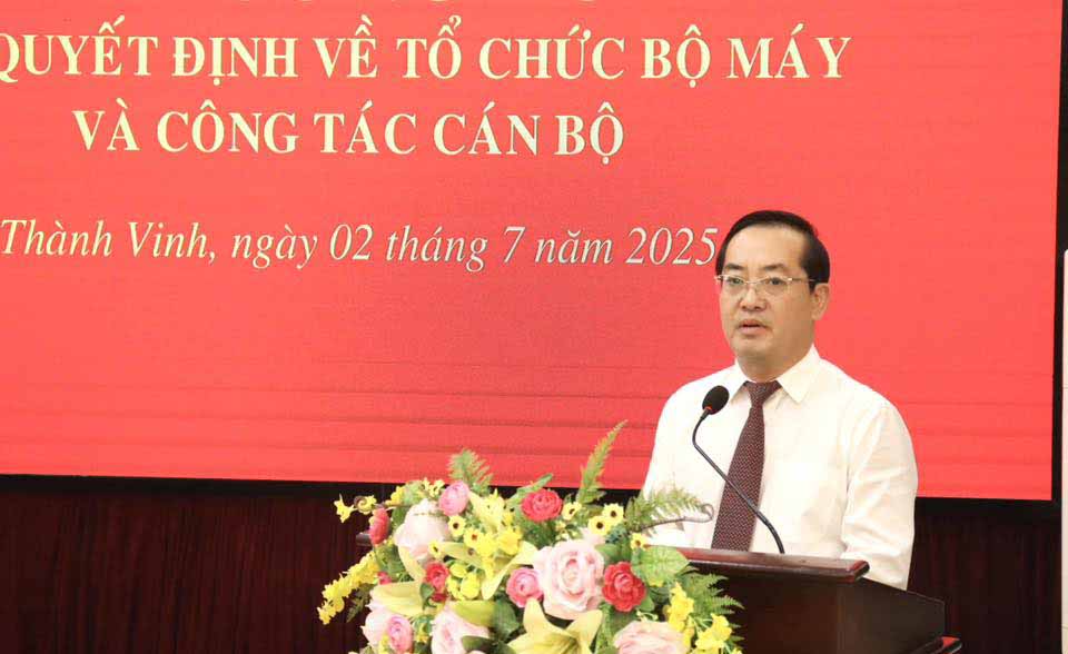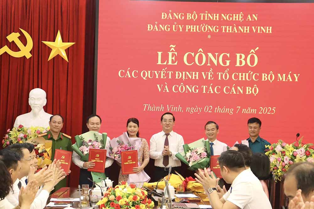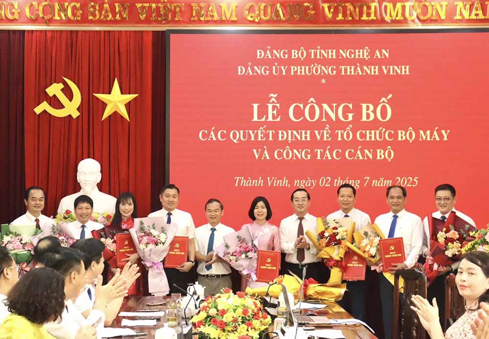 Chiều 2-7, Ban thường vụ Đảng ủy phường Thành Vinh tổ chức lễ công bố các quyết định của Đảng ủy về thành lập các tổ chức cơ sở Đảng và công tác cán bộ, nhiệm kỳ 2025-2030. Đồng chí Nguyễn Văn Lư, Bí thư Đảng ủy, Chủ tịch HĐND phường Thành Vinh chủ trì.