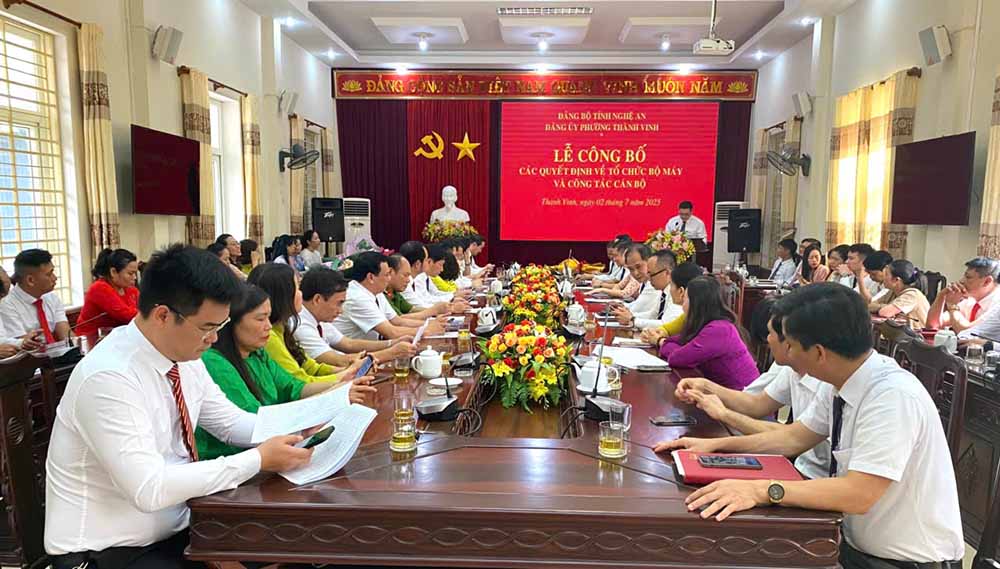 Tại buổi lễ đã công bố các quyết định của Ban Thường vụ Đảng ủy phường Thành Vinh về thành lập Ban Xây dựng Đảng; Quyết định về thành lập Cơ quan Ủy ban Kiểm tra Đảng ủy phường; Quyết định về thành lập Văn phòng Đảng ủy phường; Quyết định thành lập Đảng bộ cơ quan đảng phường, Đảng bộ UBND phường, Chi bộ cơ quan Ủy ban MTTQ Việt Nam phường; Chi bộ công an, Chi bộ quân sự phường và công bố các quyết định bổ nhiệm cán bộ lãnh đạo các cơ quan, đảng bộ, chi bộ nói trên.