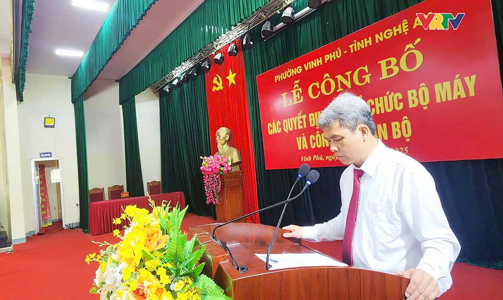 Sáng 4/7, Đảng ủy phường Vinh Phú tổ chức lễ công bố và trao quyết định về thành lập các cơ quan chuyên trách giúp việc Đảng ủy, các tổ chức cơ sở Đảng được thành lập mới và công tác cán bộ, nhiệm kỳ 2025 – 2030. Đồng chí Ngô Thị Hường – Bí thư Đảng ủy phường, Chủ tịch HĐND phường Vinh Phú chủ trì hội nghị.