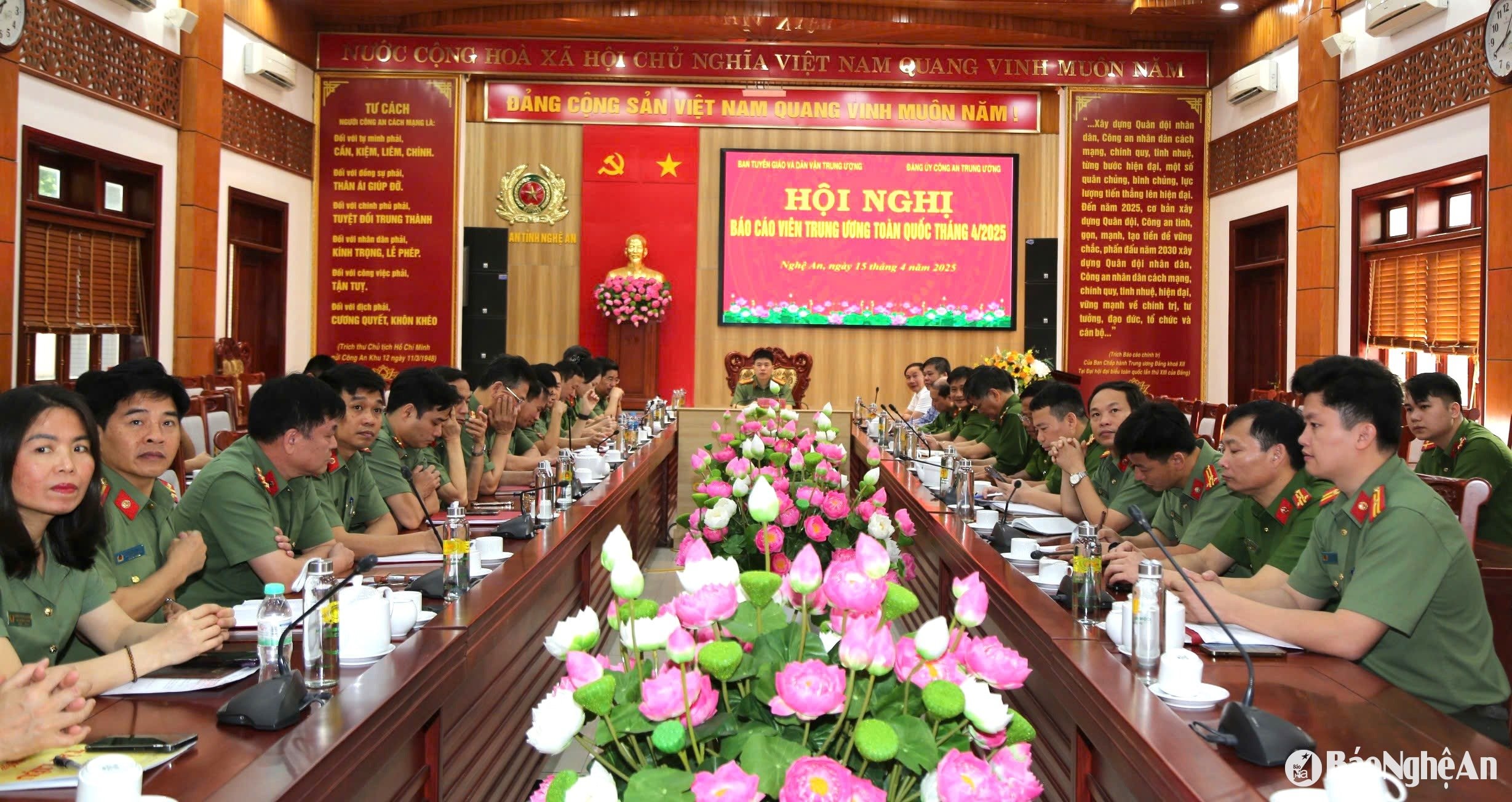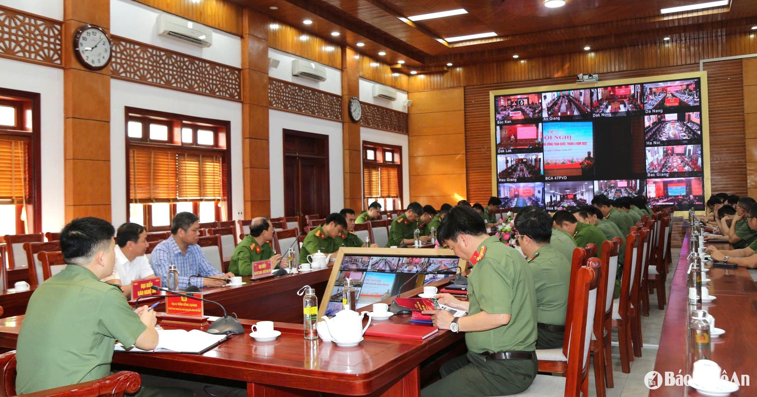 Tại điểm cầu Nghệ An, Đại tá Trần Hồng Quang – Phó Giám đốc Công an tỉnh chủ trì. Tham dự có đại diện lãnh đạo Ban Tuyên giáo và Dân vận Tỉnh ủy, các cơ quan báo chí trên địa bàn, cùng đại diện công an các đơn vị, địa phương. Ảnh: Đ.C
